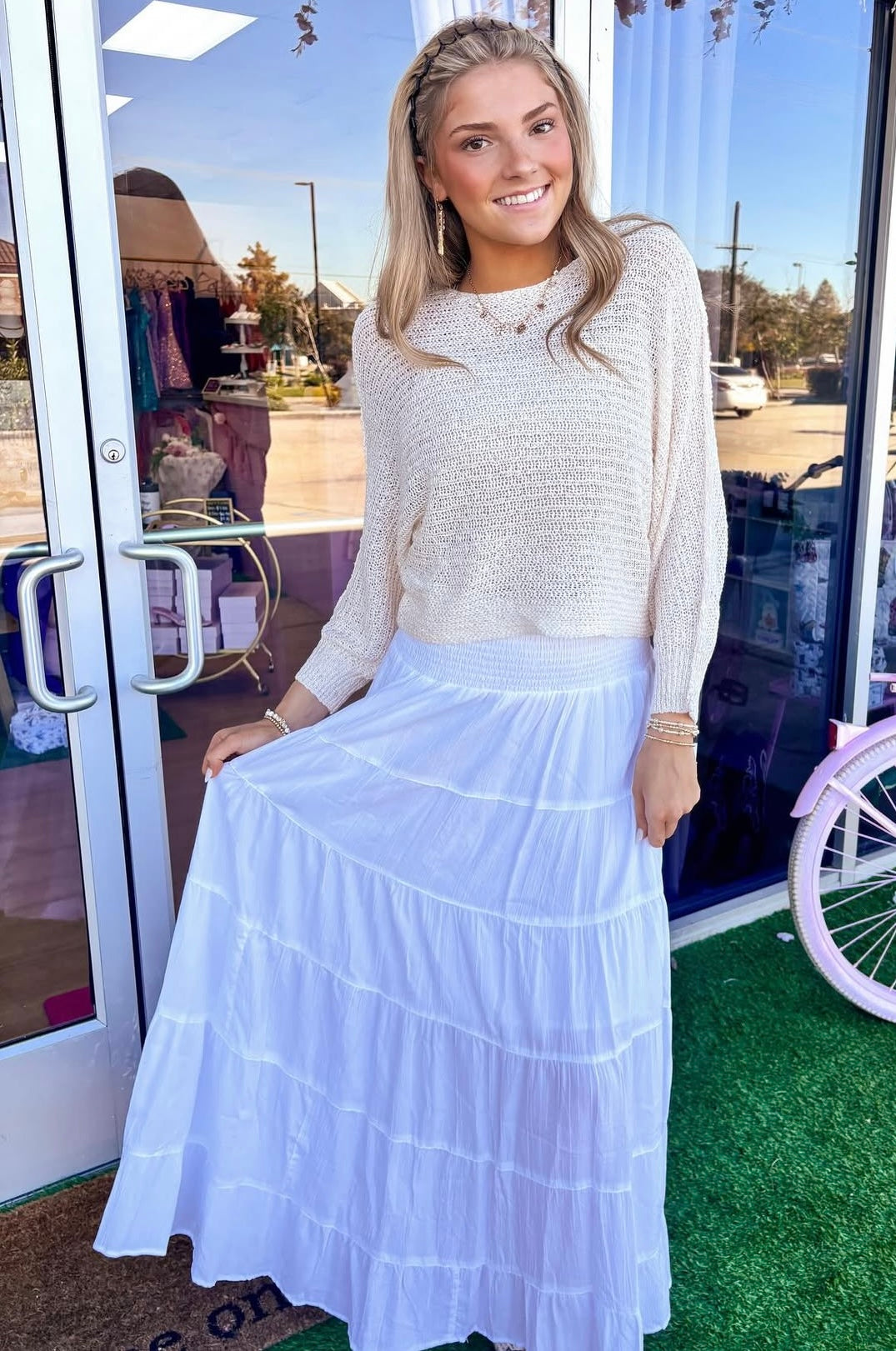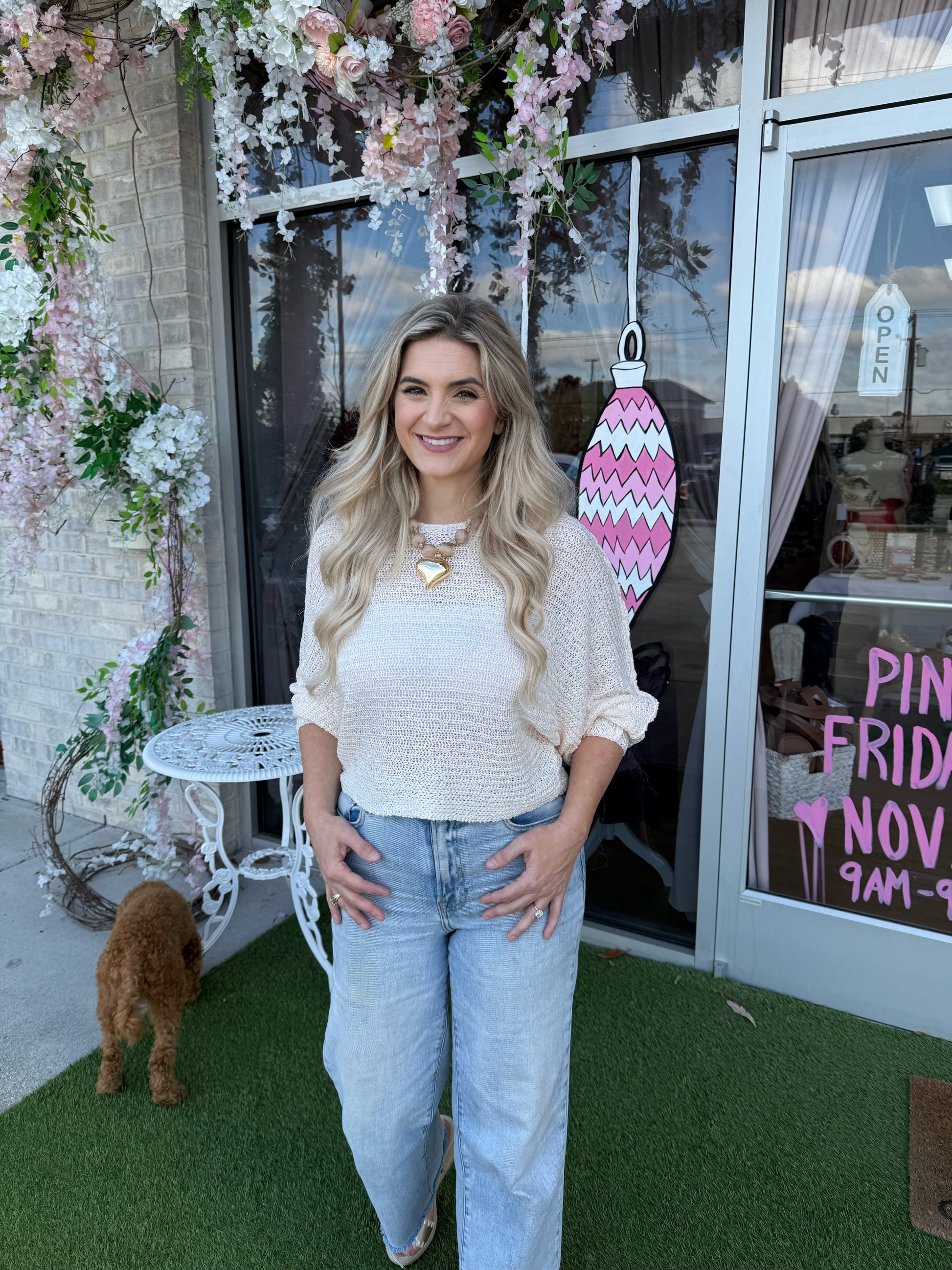 This creamy pullover sweater is perfect for fall weather! So cozy and comfy. You can feel the warmness of the fabric and also keep yourself content either way with breeze that can flow between this sweaters open knit pattern! The perfect sweater!